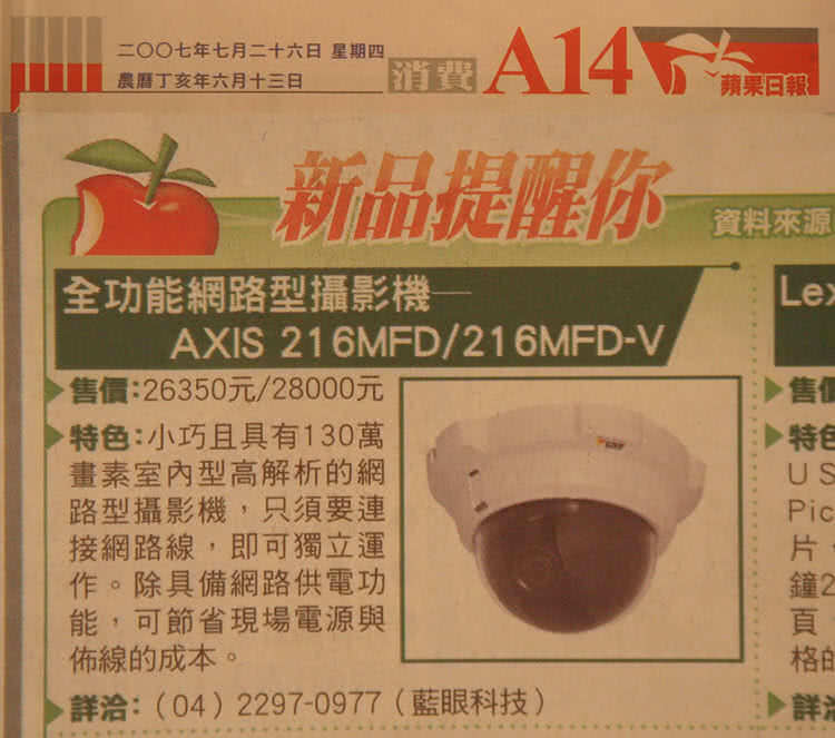 蘋果日報於七月二十六日報導藍眼科技新產品AX-216MFD