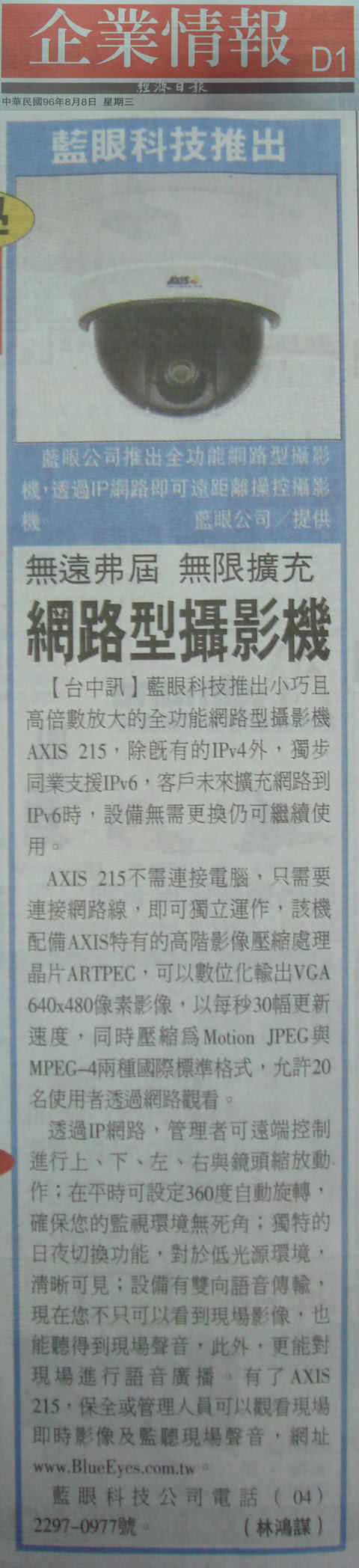 经济日报于八月八日报导蓝眼科技新产品AX-215